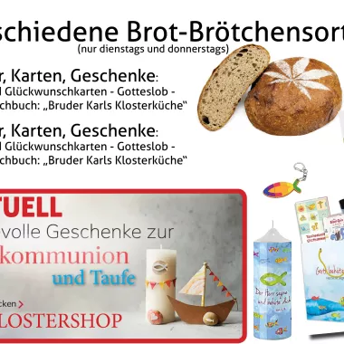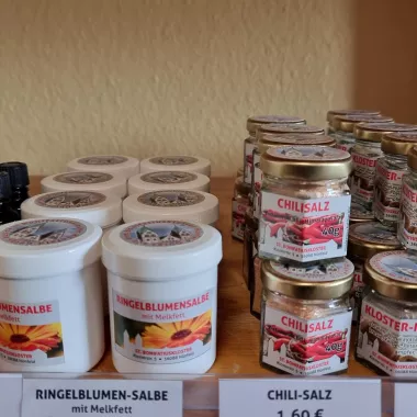Besonders beliebt sind die Köstlichkeiten aus unserer Klosterküche – viele davon bekannt aus den Kochbüchern von Bruder Karl („Der genial kocht“). Fruchtaufstriche, Essige, Kräutersalze und süße Spezialitäten erfreuen sich großer Nachfrage.