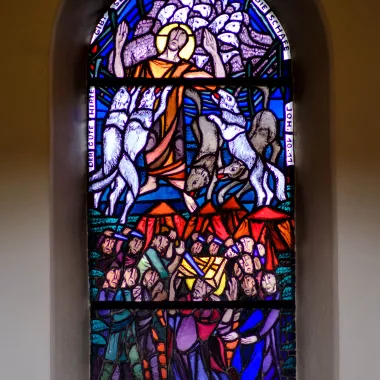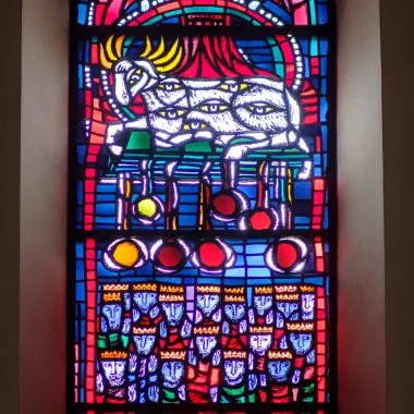 Im Lamm (Mittelfenster) schildert der Seher Johannes Jesus, den Gekreuzigten, der sein Leben für die sündigen Menschen dahingab und nun in der Herrlichkeit Gottes lebt, in den beiden flankierenden Fenstern sind jeweils zwei Evangelien in ihren Symbolen zu sehen (rechts: Adler – Johannesevangelium, Stier – Lukas; links: Markus – Löwe, Matthäus – Mensch ).