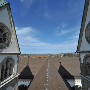 Die doppeltürmige Südfassade ist durch Rosetten, Rundbogenfenster, Lisenen und Friese reich gegliedert. Die beiden Türme tragen romanische Rautenhelme und haben angebaute runde Treppentürmchen. Im Südturm hängen drei Glocken aus den Jahren 1441 (Schlagton b) und 1967 (Schlagtöne cis und gis).