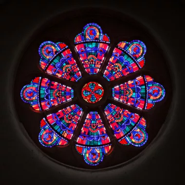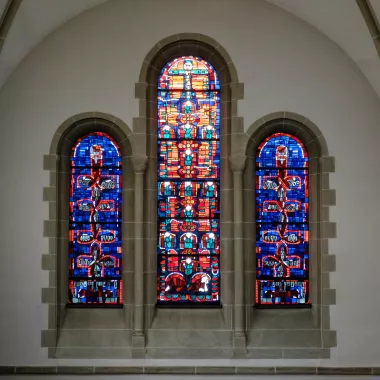 Diese drei Fenster haben für unsere Kirche die gleiche Aufgabe wie in den alten Basiliken die Darstellungen des Pantokrator – Christus in der Apsis.
