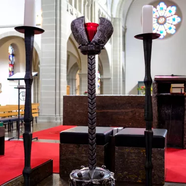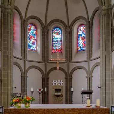 Vom Reliquiar unseres Gründers, des heiligen Eugen von Mazenod aus hat man einen unverstellten Blick in den Altar – und Chorraum. Der wuchtige Altarblock zieht spontan die Blicke auf sich. Altar und Chorraum sind deshalb so großzügig entworfen, um Platz für Priesterweihen und Gelübdefeiern zu haben.