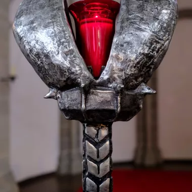 Hängekreuz und Tabernakel aus Kupfer und Bronze, mit Halbedelsteinen und Bergkristallen besetzt, fertigte die Kunstwerkstatt der Abtei Maria Laach.
