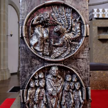 Besondere Aufmerksamkeit verdient der Ambo, geschaffen von Frau Agnes Mann. Hauptaufgabe unseres Ordens ist die Verkündigung der Frohen Botschaft gemäß unserem Wahlspruch: „Den Armen die gute Nachricht zu bringen, hat mich der Herr gesandt“ (Jes 61,1). Das obere Medaillon zeigt einen sechsflügeligen Seraph, der mit einer glühenden Kohle den Mund des Propheten Jesaja reinigt, damit er zum wahrhaftigen Zeugen Gottes werden kann (vgl. Jes 6,1-6). In der Messliturgie betet der Prediger vor der Verkündigung des Evangeliums: „Heiliger Gott, reinige meine Lippen, damit ich dein Evangelium würdig verkünde“. Das untere Medaillon zeigt Eugen von Mazenod umgeben von Mitbrüdern in der Ordenstracht (Soutane und Kreuz).