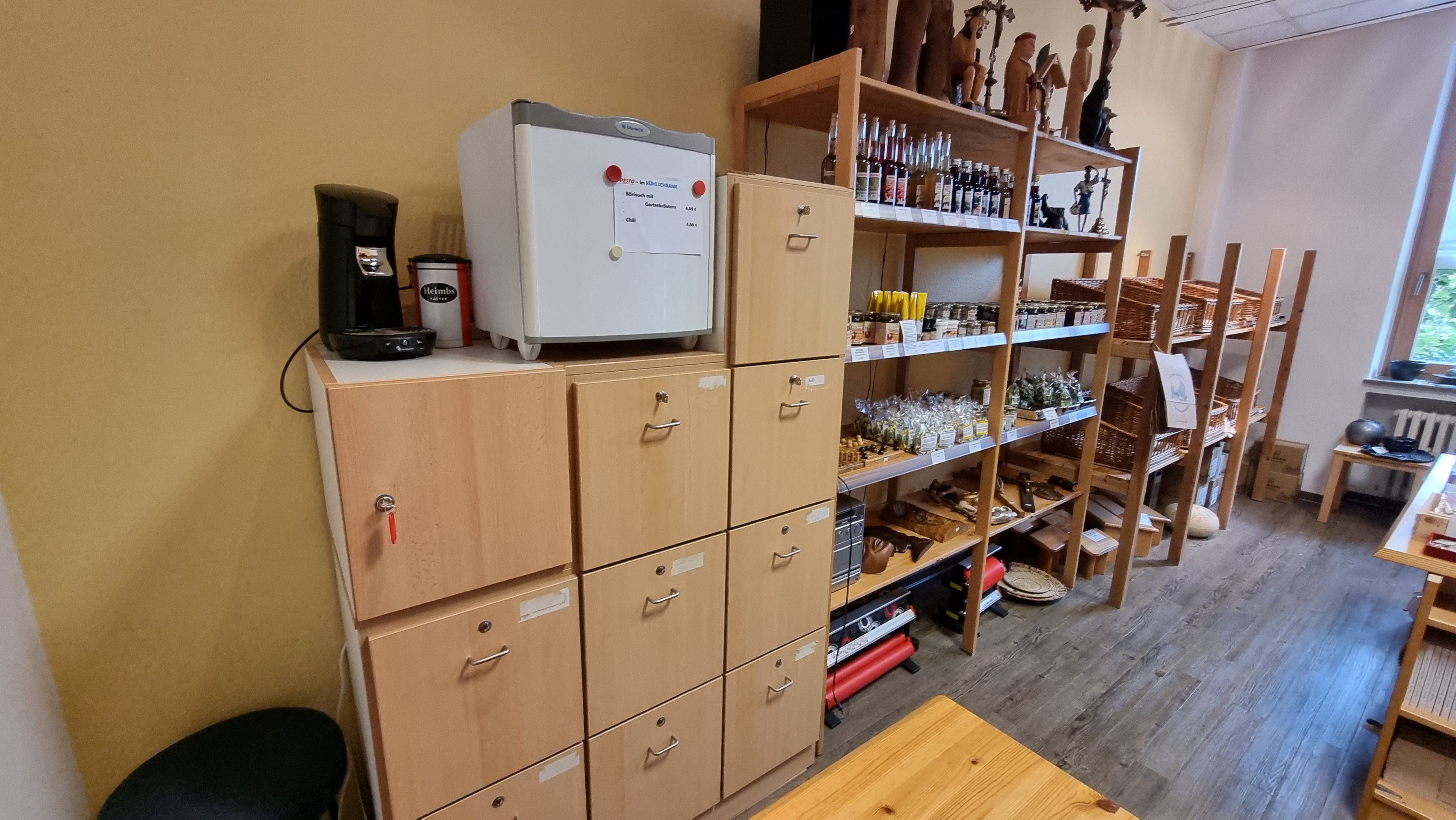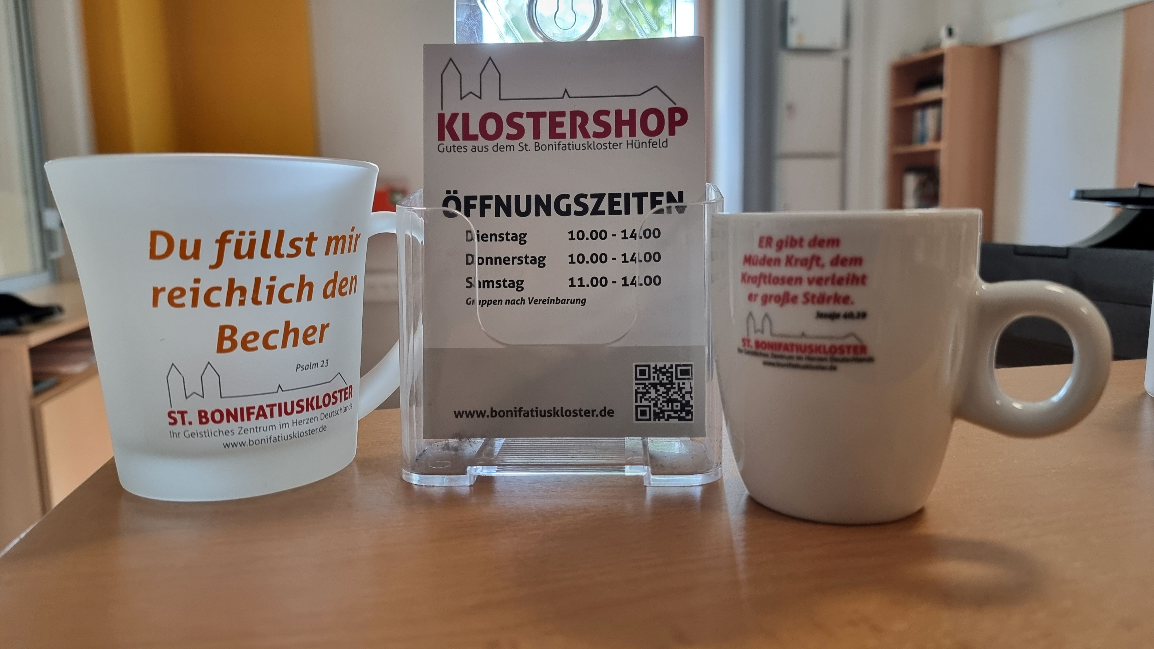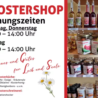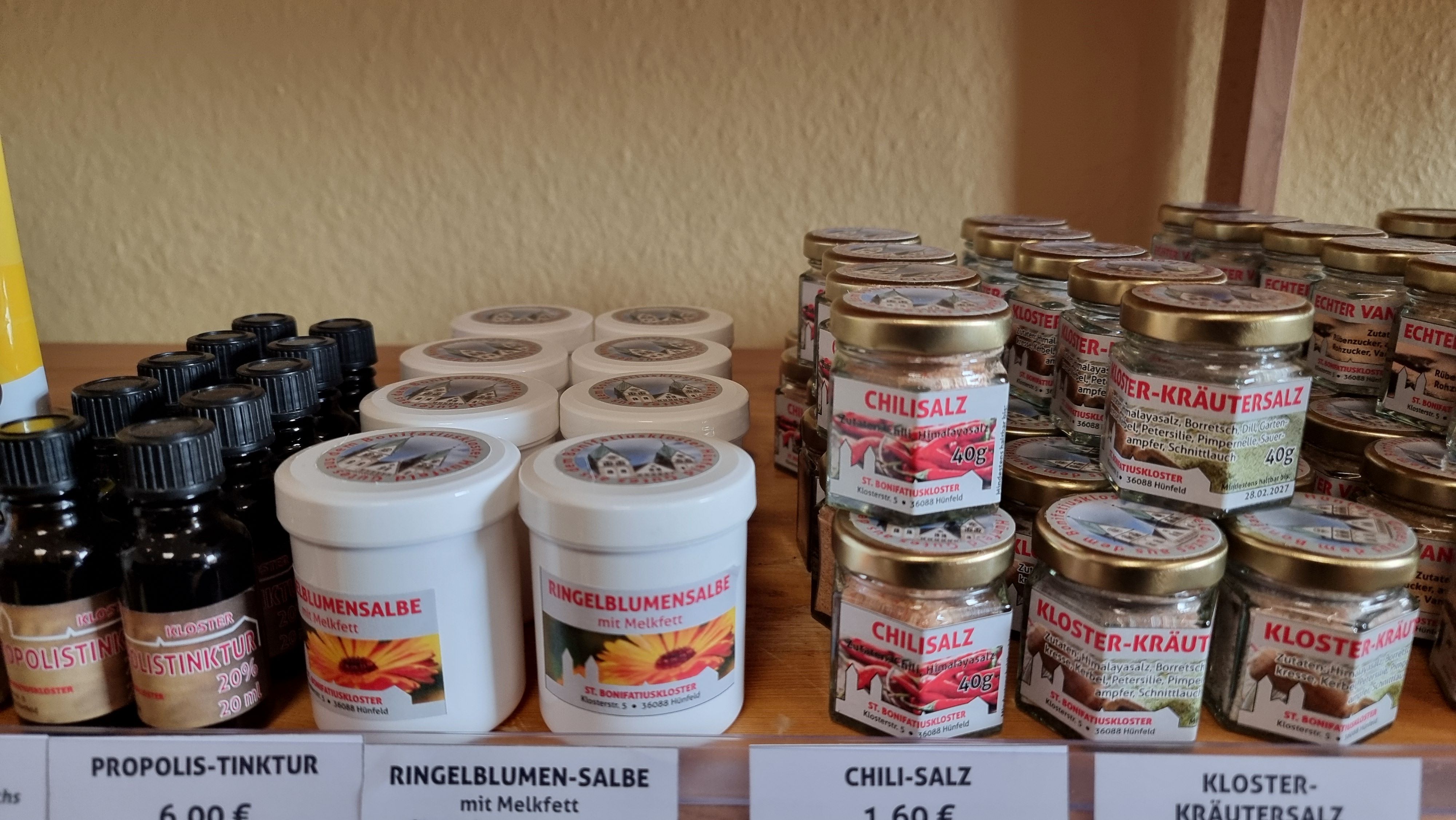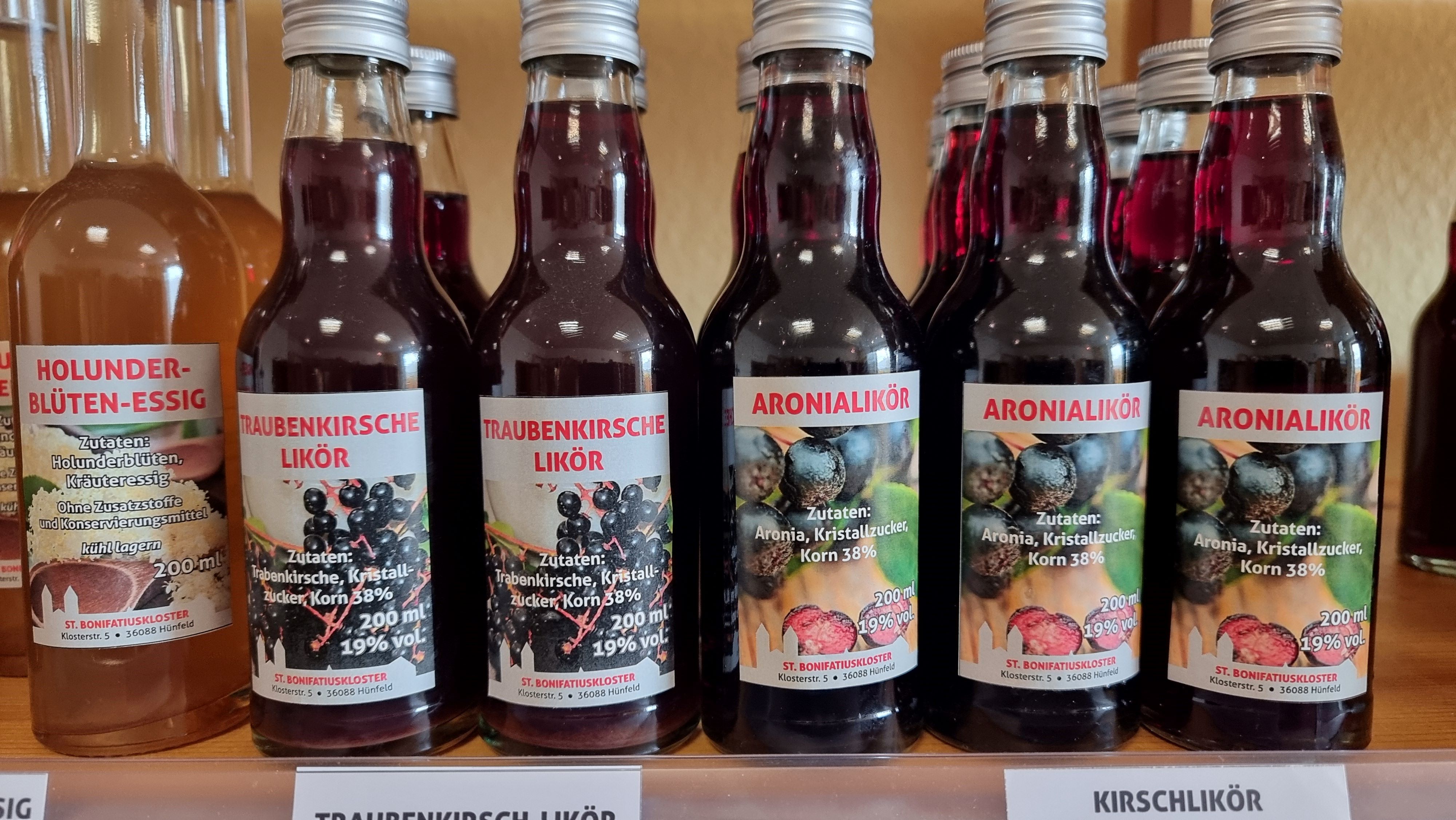 Im Klostershop des Bonifatiusklosters in Hünfeld finden Sie eine vielfältige Auswahl an Erzeugnissen aus klösterlicher Produktion: Honig von den Klosterbienen, Liköre nach alten Klosterrezepten, Eingemachtes und vieles mehr.
