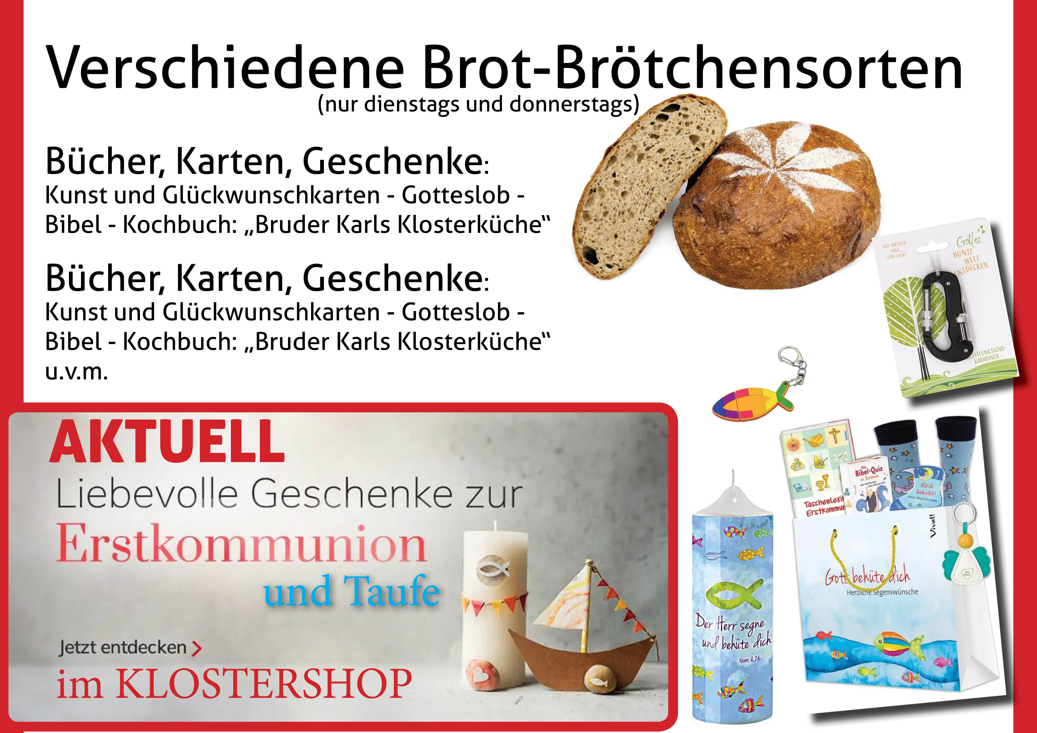 Besonders beliebt sind die Köstlichkeiten aus unserer Klosterküche – viele davon bekannt aus den Kochbüchern von Bruder Karl („Der genial kocht“). Fruchtaufstriche, Essige, Kräutersalze und süße Spezialitäten erfreuen sich großer Nachfrage.