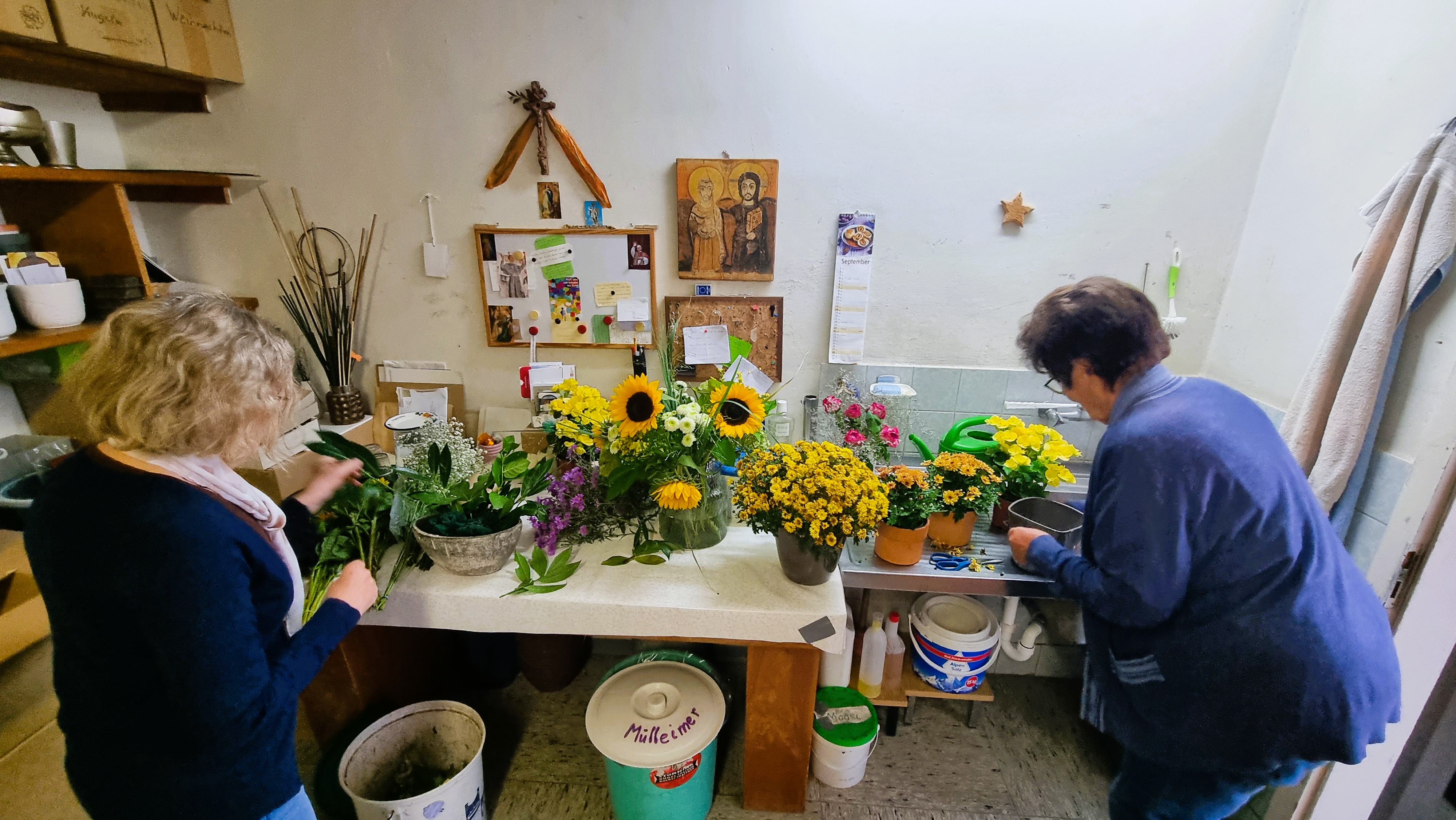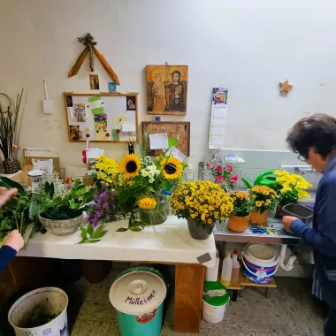 Fünf Frauen sorgen Woche für Woche mit viel Liebe und Kreativität für den Blumenschmuck in Klosterkirche und Hauskapelle – zur Ehre Gottes und zur Freude der Mitfeiernden.